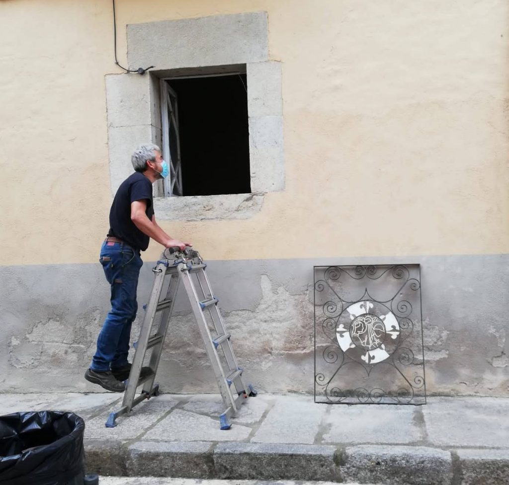 En la finestra on s’havia tret la reixa de l’anagrama, es posà una nova reixa en la que el Sr. Josep Pujadas, reproduí de forma esquemàtica com la porta d’entrada a la casa.