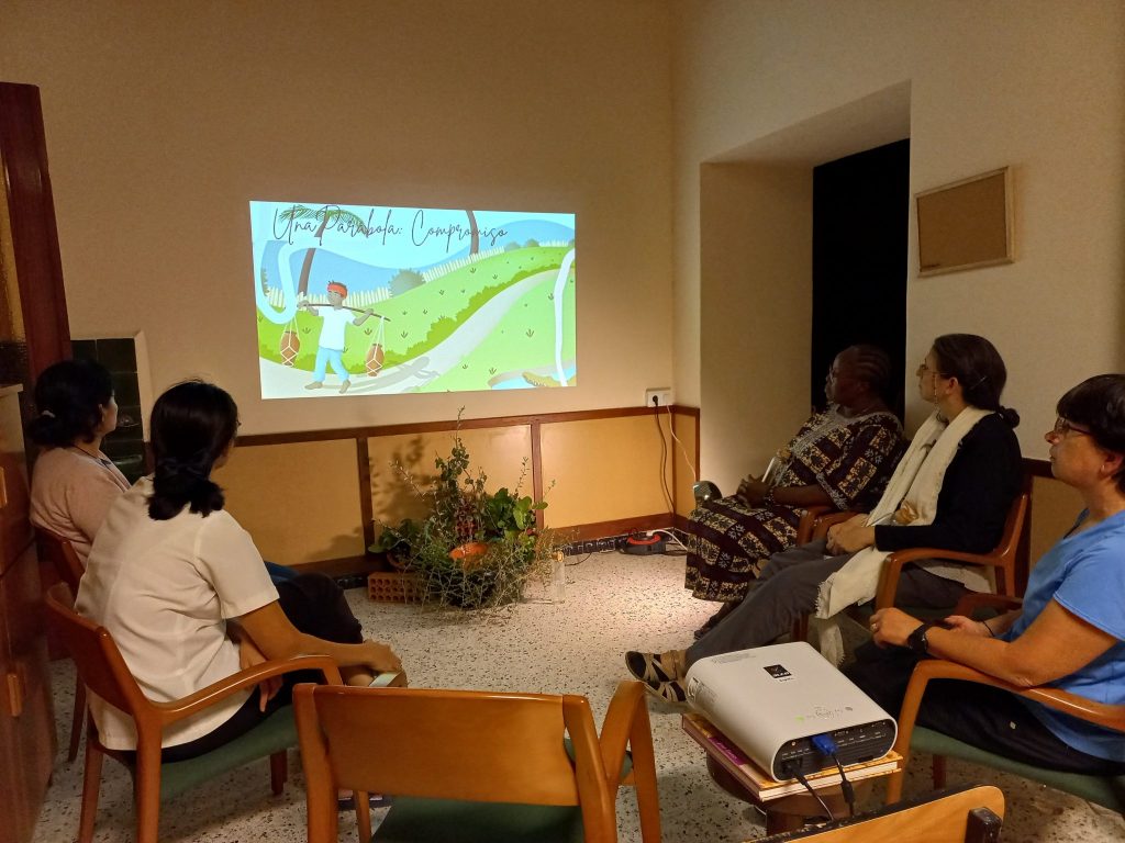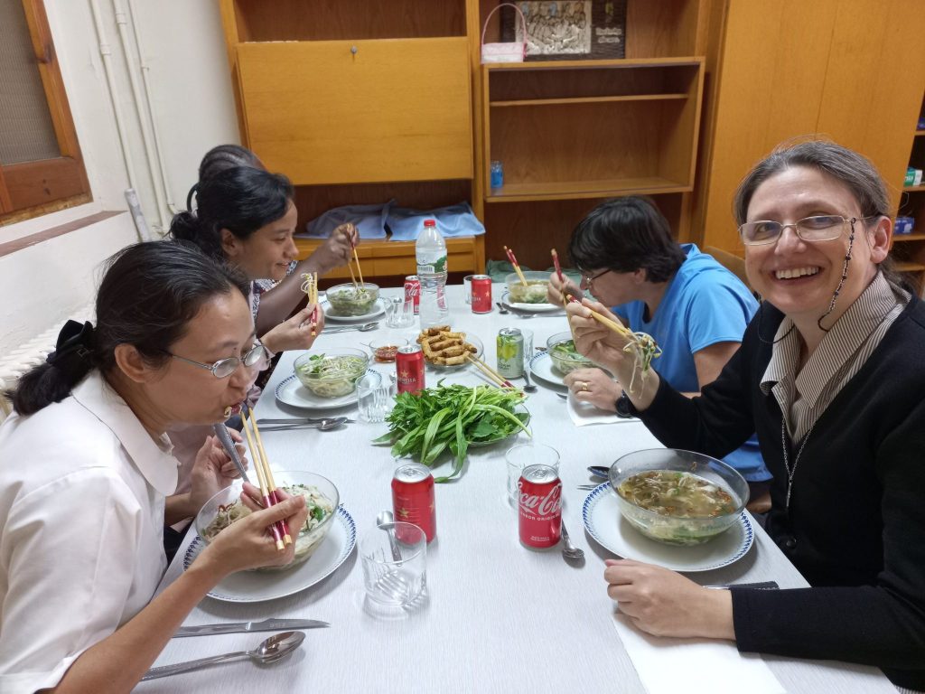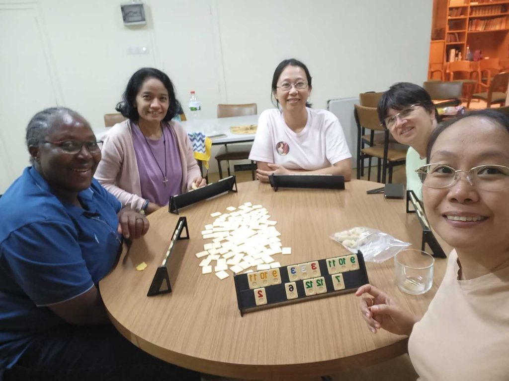 También tuvimos otros momentos significativos de distensión y ocio: en la mesa durante las comidas, compartíamos sobre nuestras respectivas culturas y recordando anécdotas divertidas que cada una tuvo durante los primeros años en la Congregación, continuábamos en el recreo de la primera noche, el karaoke fue la ayuda para nuestros cantos, y la última jugando rummy. Gozamos mucho el tiempo que pasamos juntas, incluidos los momentos de preparación de las comidas y de limpieza. Hay que destacar cómo disfrutamos de la comida asiática y cómo todas intentamos aprender a comer con palillos.