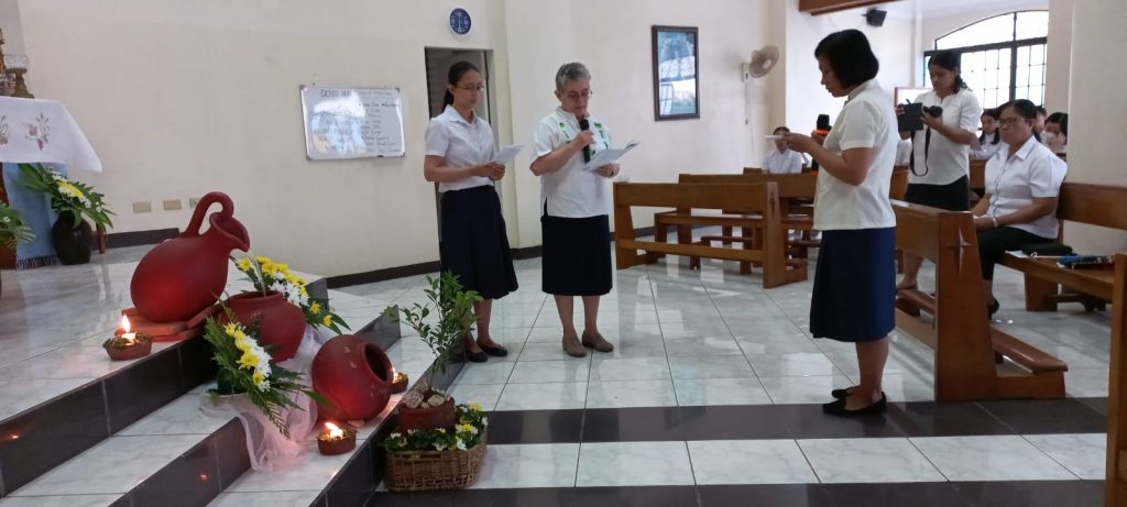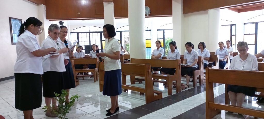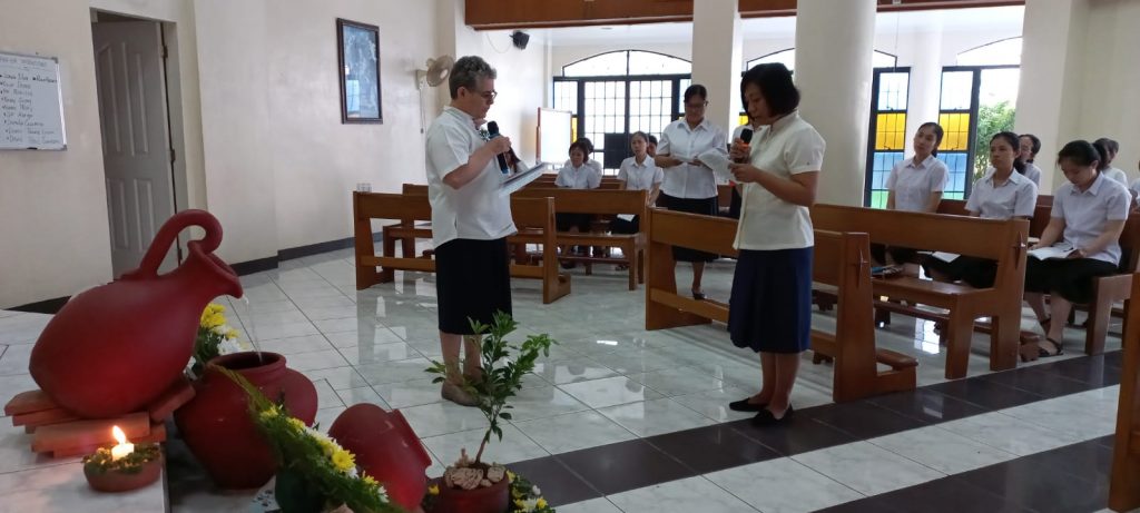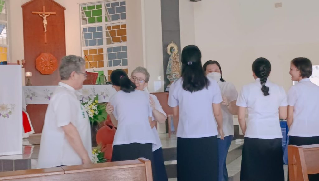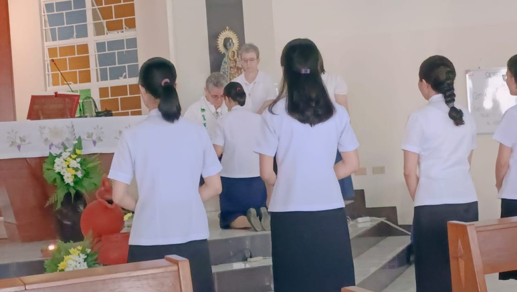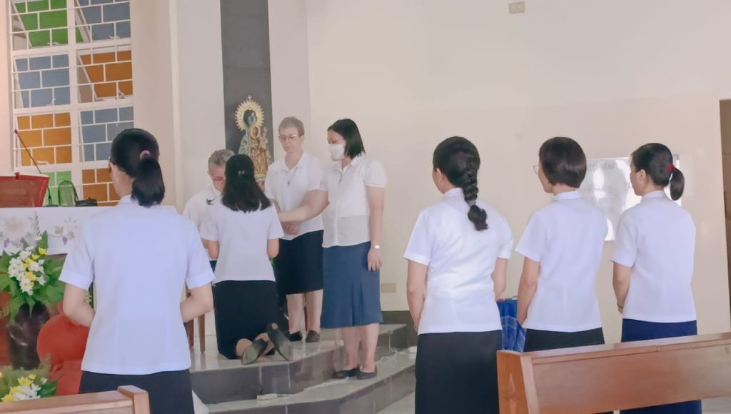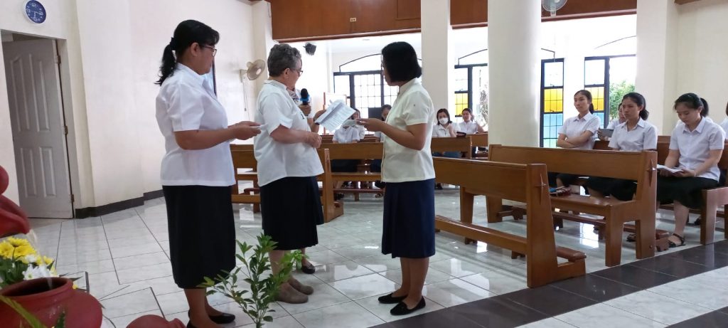 Hoy, 16 de junio de 2023, al reunirnos nuestras tres comunidades de Filipinas en San Carlos City, Pangasinan, como una gran familia, hemos tenido una doble celebración a primera hora de la mañana, en la capilla de nuestra comunidad: la Entrada al Noviciado de nuestra postulante Eden Pazzibugan, que se integró en la solemne celebración de Laudes y la segunda renovación de votos de las Hermanas en temporales: Nguyen Phuong Thuy, Ho Thi Bich Ngoc, Parla Mae Mosida, Tran Thi Bich Kim y Nguyen Thi Thu Huong dentro de la celebración de la Eucaristía.