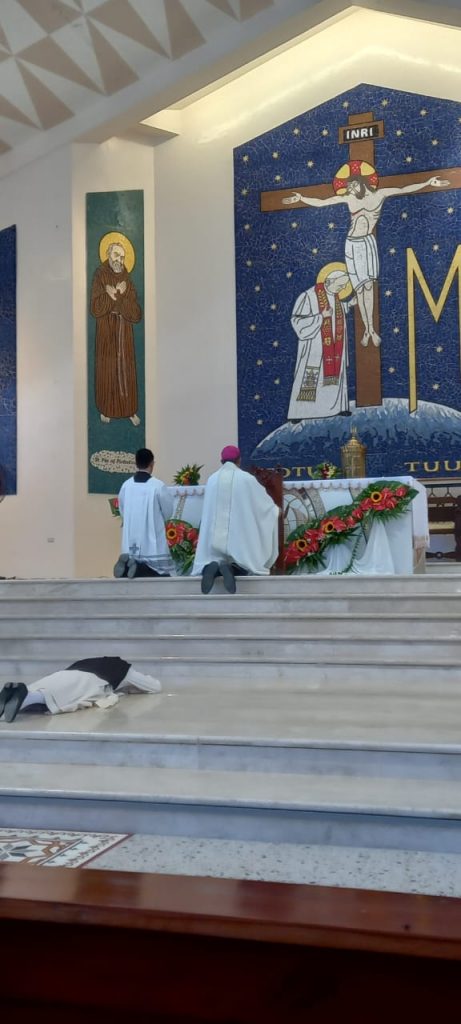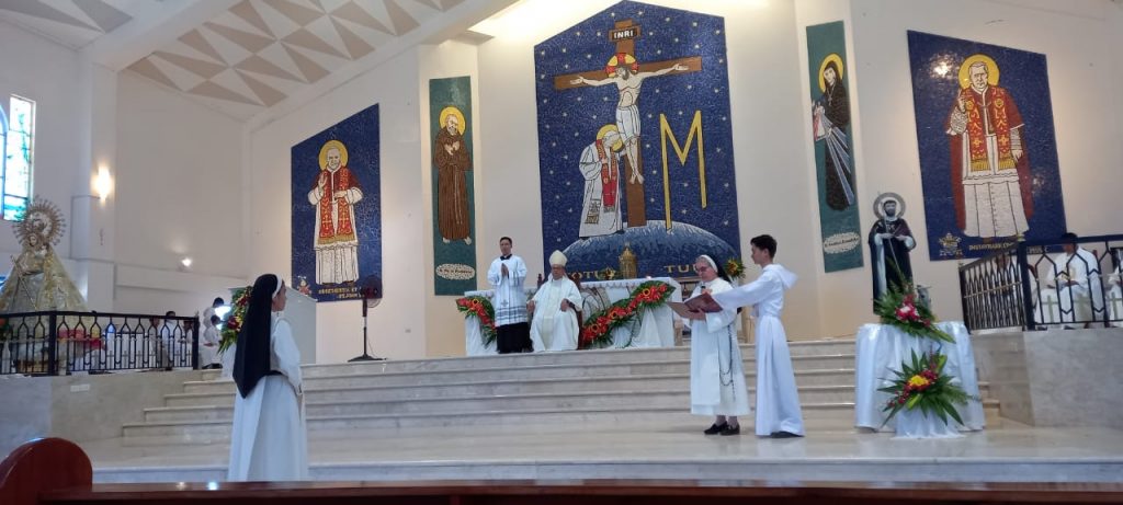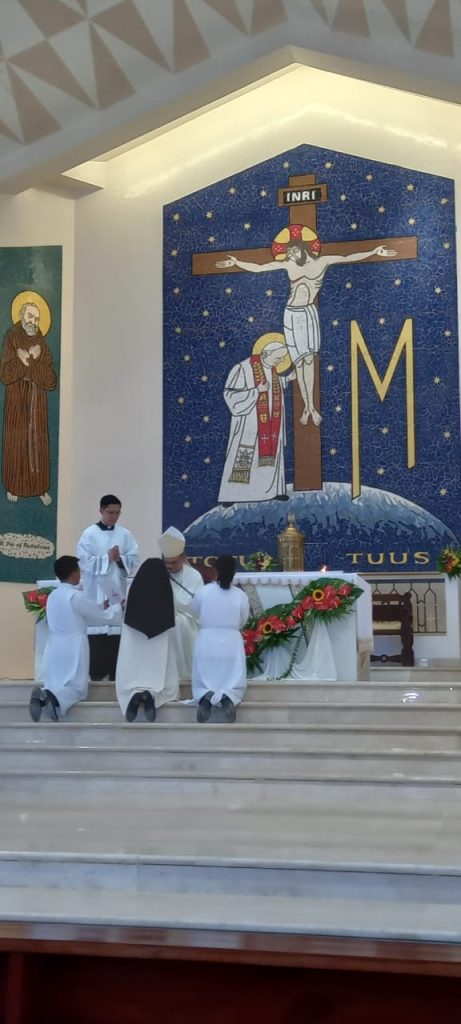 El Obispo Fidelis Layug presidió la Eucaristía, concelebrada por varios sacerdotes y asistencia de familiares, amigos y feligreses de la parroquia. Fue una celebración alegre y muy solemne. En su homilía, el obispo dio las gracias a la Hna. Analiza por haber elegido seguir a Dios a través de la vida religiosa. Sin embargo, hizo hincapié en este día, en que no se trata que nosotras elegimos seguir a Dios, sino un recordatorio de que Dios nos eligió a nosotras. No fuimos nosotros los primeros que desearon, amaron y eligieron seguirle, si no Dios, que nos eligió amarnos primero. Esto indica que, ante todo, es Dios quien nos ama cada día… Él es el protagonista de toda vocación.