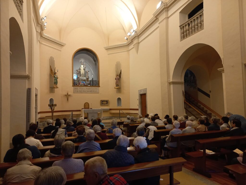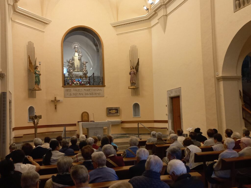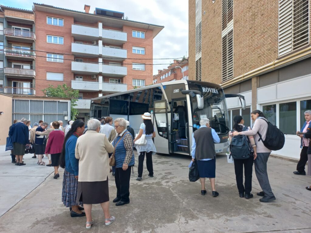 Dissabte 1 de juny, vigília de la solemnitat del Corpus Chisti, va tenir lloc la celebració de la trobada comunitària provincial de final del curs 2023-24, de les activitats programades per la Província. El lloc designat, Santuari de la Mare de Déu dels Àngels (Girona). El dia escollit no podia ser més  adient i significatiu per donar-li el caire de festa i comunió que es pretenia. Deixàvem els cotxes petits al pati de la Casa Mare de Vic i ens repartíem en dos autocars les 61 Germanes que hi participàvem. Tenia el seu sentit per reforçar els llaços fraterns, tan personal com comunitàriament.