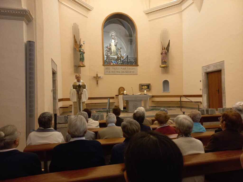 Arribades al Santuari, ens esperava Mn. Felix Mussoll, rector de la Parròquia de Salt, bon amic d’algunes de les  Germanes que ens acompanyaven.  Va presidir l’emotiva Eucaristia, sagrament de la Caritat, expressió de l’amor de Déu amb nosaltres. Va llegir i comentar l’Evangeli de l’Anunciació, tan conegut per totes però, com va dir ell, sempre porta novetat. Sou Dominiques de l’Anunciata, ens deia, i heu d’anunciar el Crist tenint com a referència el vostre Fundador, el Pare Coll, que ho va fer amb la Paraula ,  la Predicació i la Pobresai a exemple de Maria, amb senzillesa, humilitat,  discreció i amb les portes del cor ben obertes per acollir sempre a tothom.