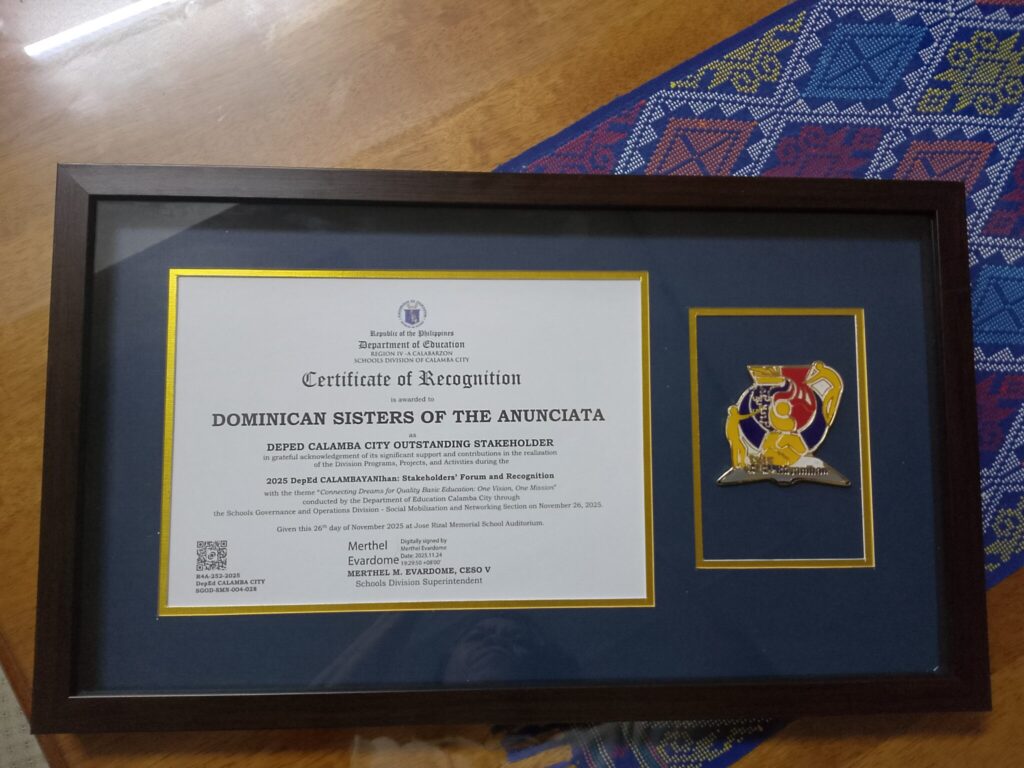 Uno de los reconocimientos más destacados fue otorgado a la Congregación de las Hermanas Dominicas de la Anunciata, nombradas Outstanding Stakeholders de Real Elementary School por su constante apoyo, credibilidad y dedicación a la comunidad escolar. El galardón fue recibido por la Hna. Milagrosa P. Palomo, OP, en representación de la Congregación, acompañada por la directora del plantel, Lorna T. Alcover, quien expresó profundo agradecimiento por el compromiso sostenido de las religiosas.
